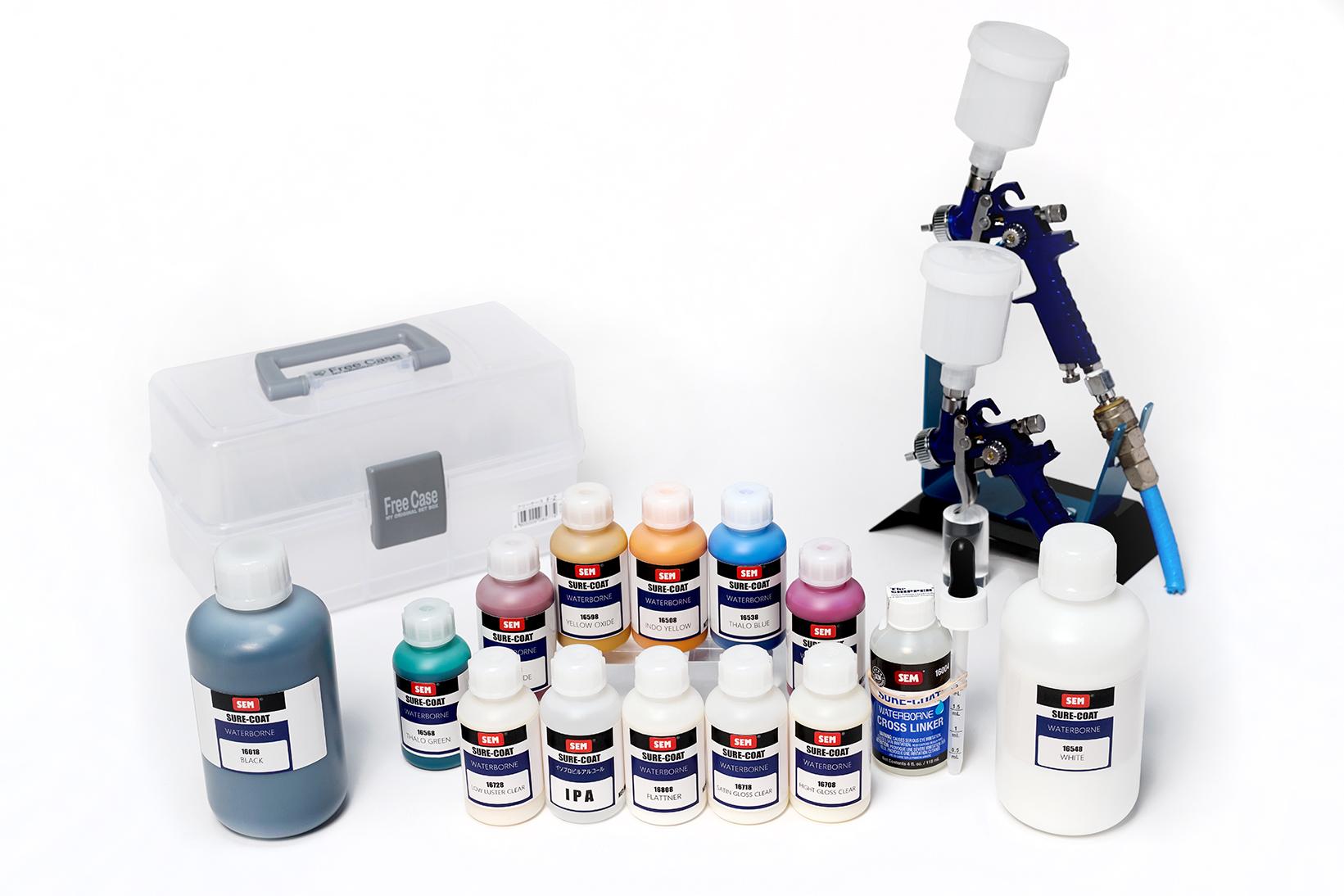 SEM SURE-COATは、水性塗料で柔軟性、密着性、耐色褪せに優れており、革、ビニールのインテリアは、もちろんプラスチックなどの肌の質感を変える事無く塗装できます。塗装ガンにより吹き付けと刷毛塗りによる塗装が可能です